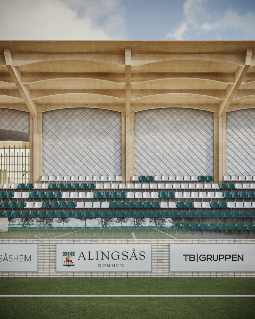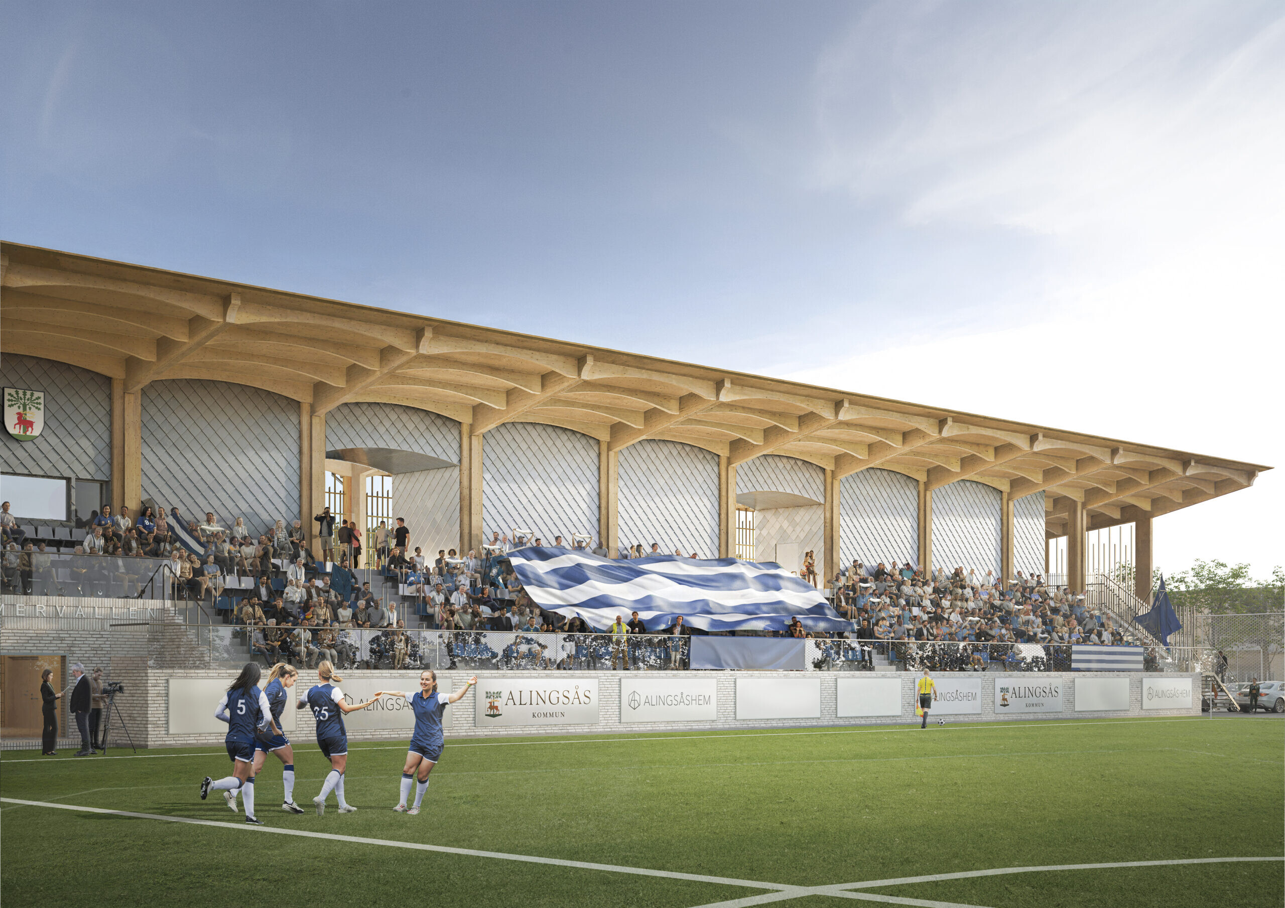 När Alingsås IF:s damlag i fotboll gick upp i Allsvenskan 2024 bestämde sig kommunen för att satsa på en ny arena. På uppdrag av Alingsåshem har Okidoki ritat en ny läktarbyggnad till Alströmervallen, en hybridkonstruktion i KL-trä och betong som kommer rymma 800 åskådarplatser. Upphandlingen för byggentreprenaden pågår under hösten 2025 och även byggstarten är planerad till slutet av samma år.