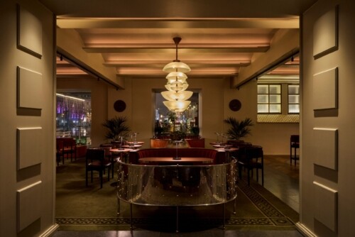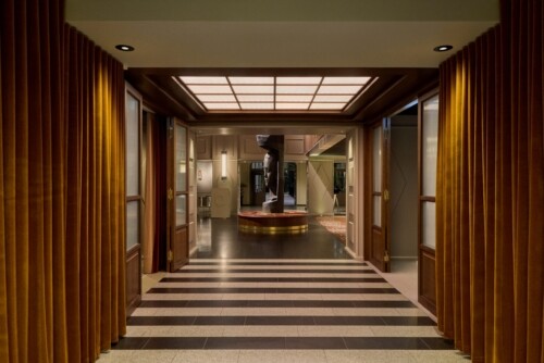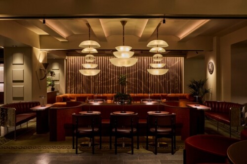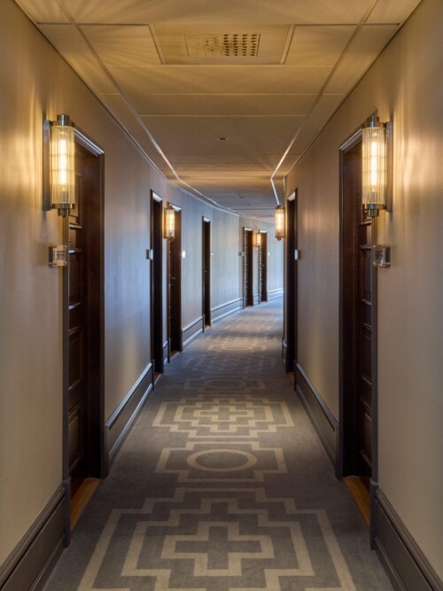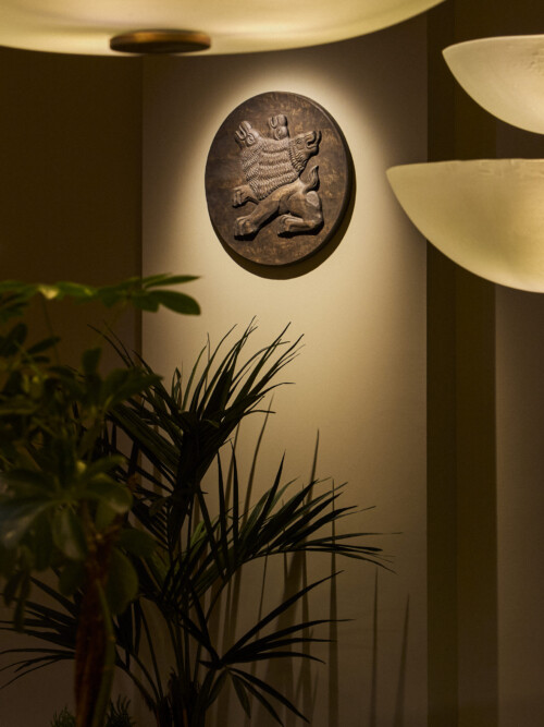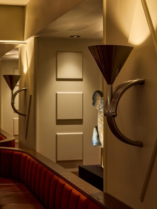 I den spatiösa lobbyn är väggen ovanför receptionen klädd av draperat tyg som tillför en taktil dimension och möter vackert de ornamenterade pelarna som ramar in ljusgården. Taket ovan receptionsdisken är försett med takarmaturer som sprider ett varmt och glödande ljus, vilket plockas upp i den generösa och välkomnande matta som klär golvet. Inne i baren erbjuder den vidsträckta bardisken gott om utrymme för gäster och blir en naturlig samlingspunkt i rummet. Husets arkitektoniska formspråk speglas i snickerier på pelare och i det ljussatta taket. Vägglampetterna är inspirerade av posthorn, vilket för en subtil dialog med husets historia samtidigt som de tillför en intressant och elegant detaljrikedom till miljön.