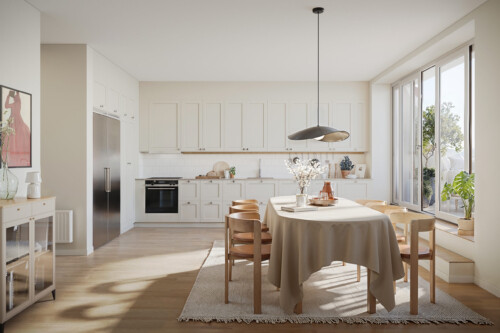 Radhusen är smarta med tre sovrum och vardagsrum med kök i öppen planlösning. Trots endast 100 kvadratmeter så är känslan att bostaden är betydligt större än vad den är. Arkitekturen är personlig och kreativ med små speciella detaljer och en vacker färgsättning.