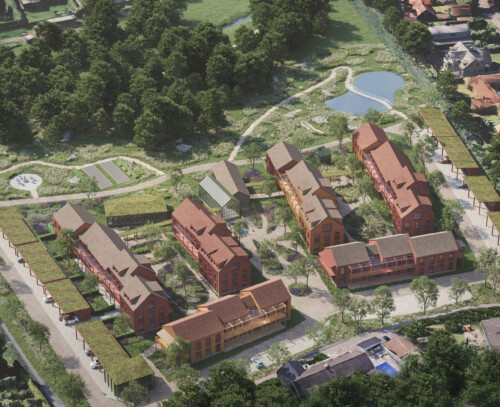 Den planerade bebyggelsen består främst av tvåvåningshus med sadeltak, där vissa centrala byggnader får förhöjt väggliv och inredd vind med takkupor för variation och liv. Träfasader och takpannor anknyter till den lantliga miljön, medan komplementbyggnader som carports och miljöhus får vegetationsklädda tak för att smälta i naturen runtomkring. Pelargångar ger skydd och skapar även en sammanhållen känsla mellan bostäderna och de gemensamma ytorna. Varje bostad har varsin privat balkong eller uteplats för avskildhet, medan framsidans entrébalkonger har en mer social karaktär.